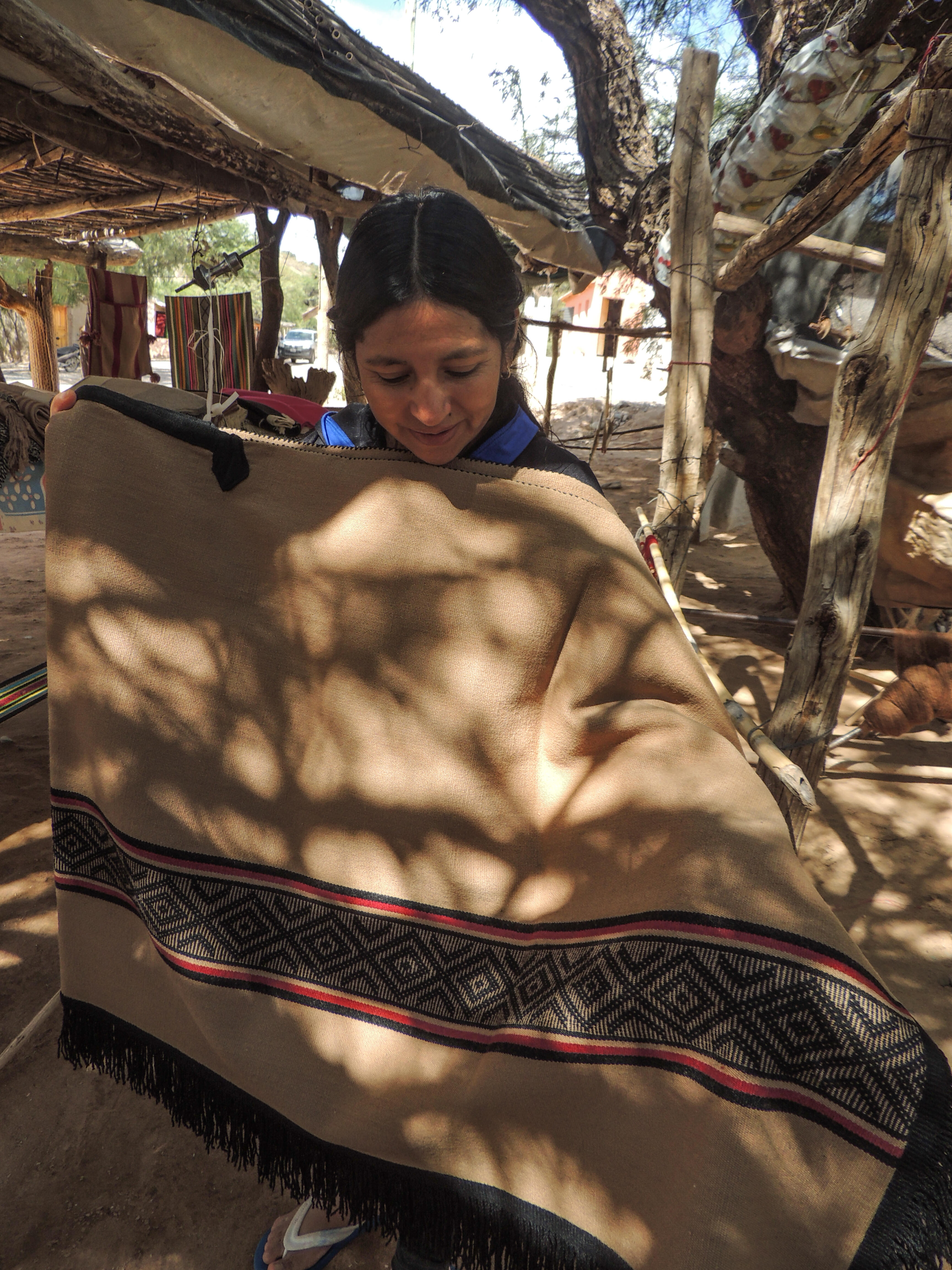 Eduardo es un experto en ponchos. Como todos los teleros del valle, tiene su pala (madera para apretar el tejido, también conocido como machete) especial para tejer el poncho y se enorgullece de ella.
