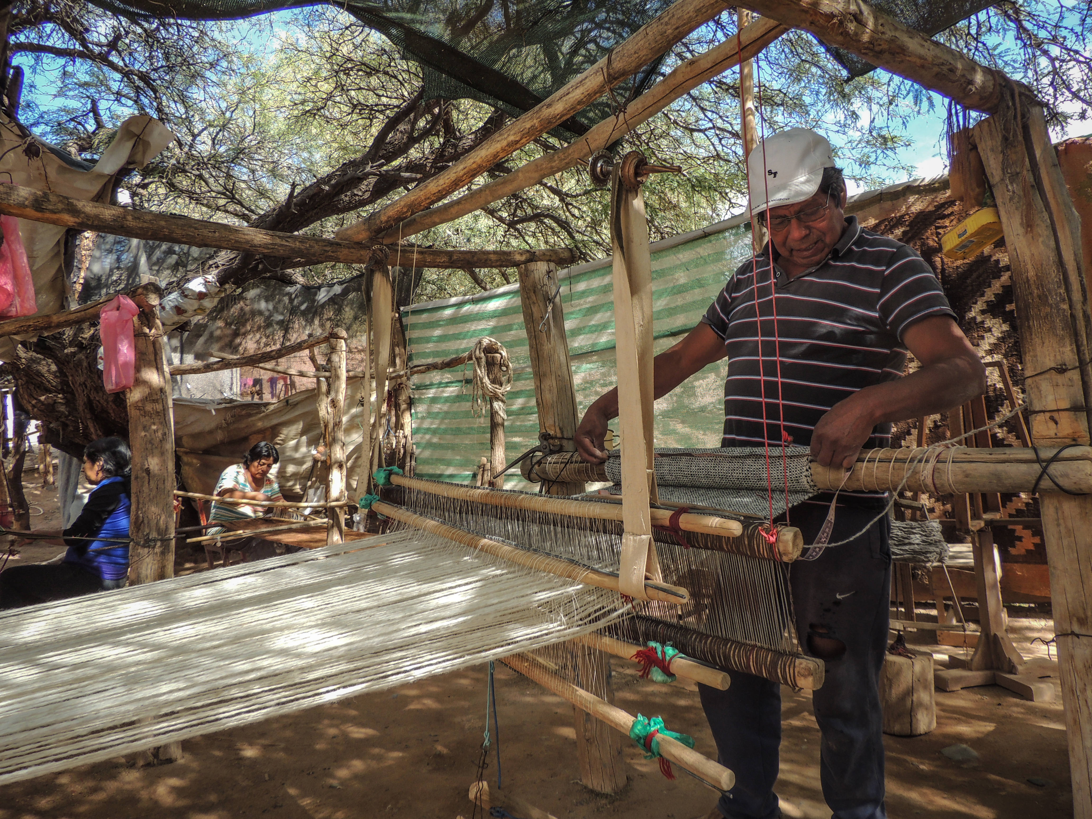 Y mientras, Eduardo teje de pie en el telar criollo o de pedales. Este telar, en la mayor parte del continente, es manipulado por hombres ya que su estructura es muy pesada y requiere un esfuerzo físico mayor que los otros tipos de telar. Éste es en el que se teje la prenda más conocida de la zona: el poncho salteño.